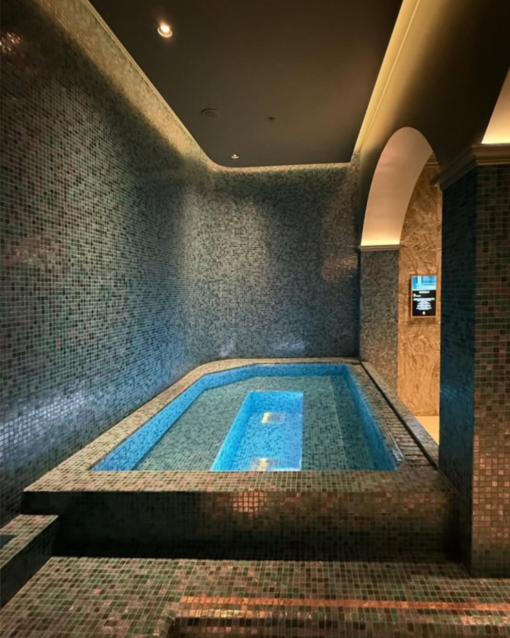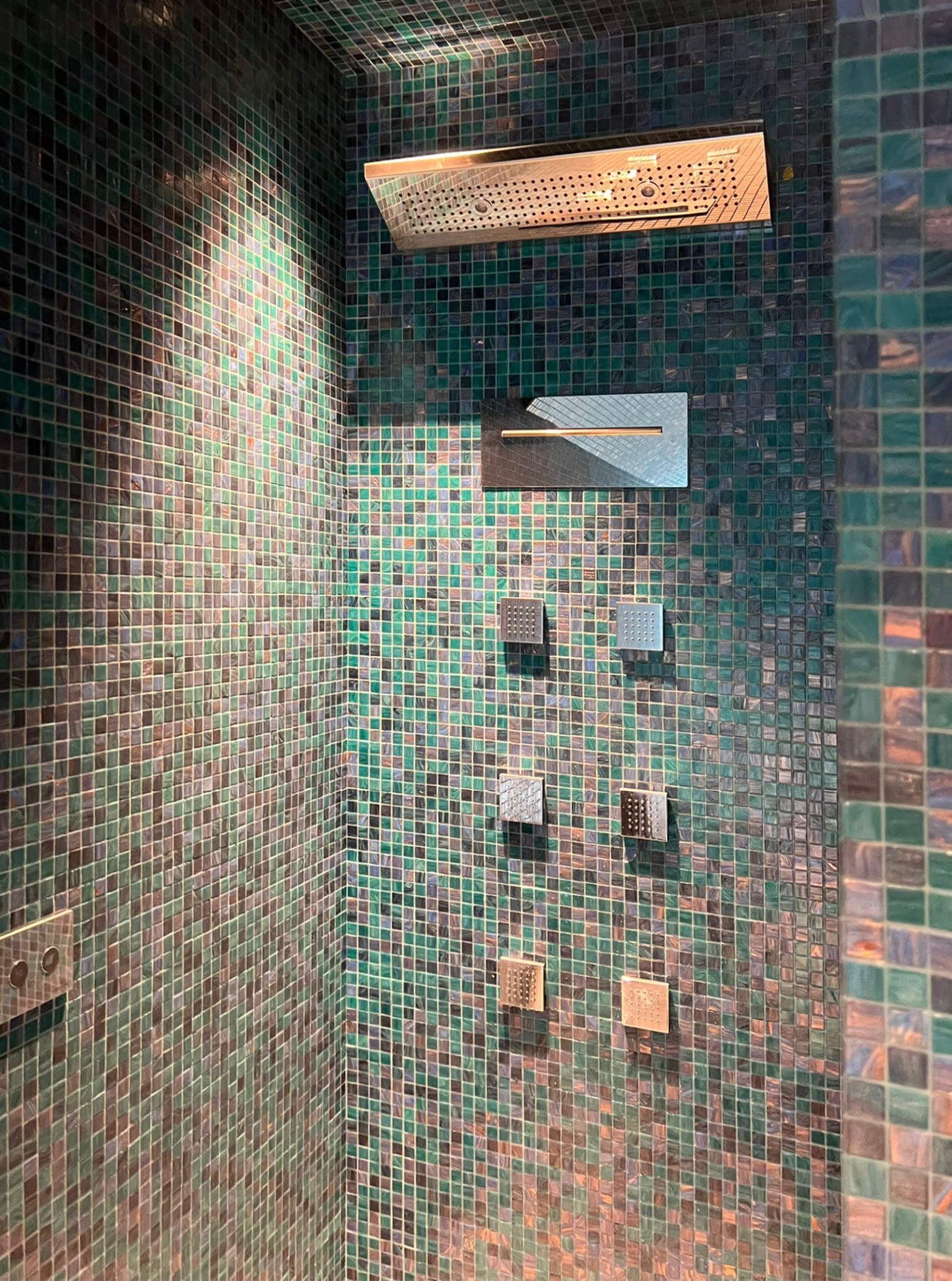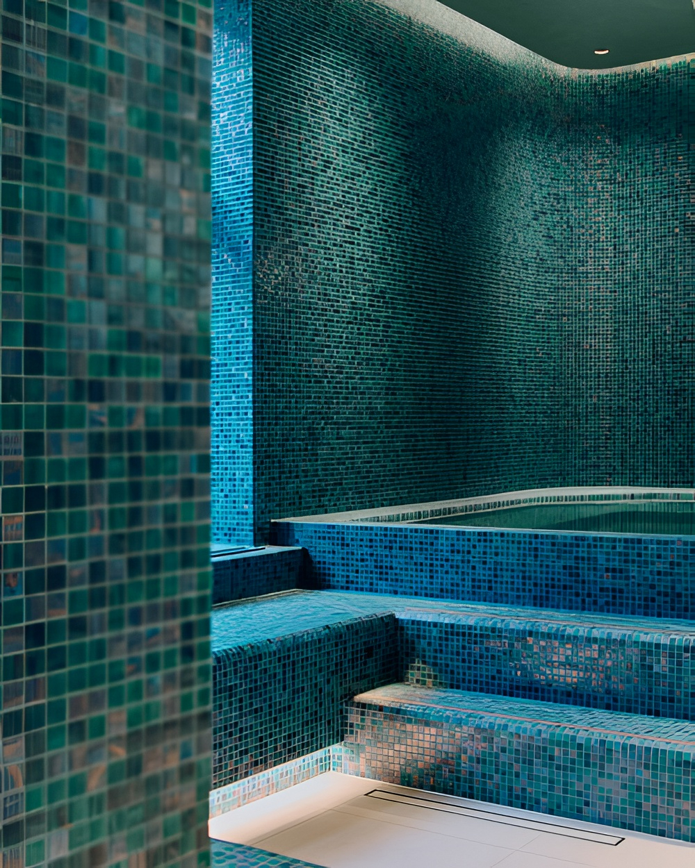 Architecturally, the spaces play with material contrasts, walls clad in shimmering mosaic in emerald green and deep petrol blue tones alternate with warmer surfaces, creating an intimate and softly lit atmosphere.